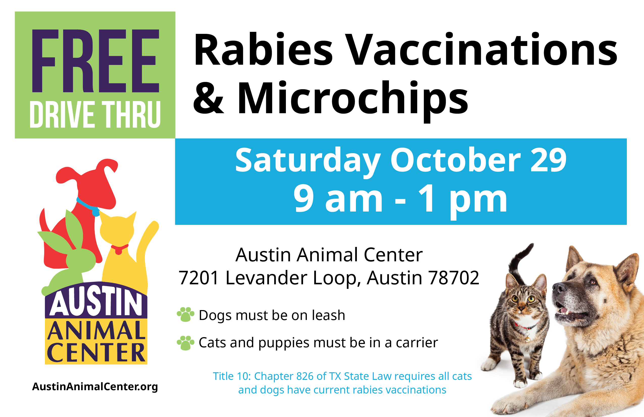 PO BOX 149347 - Austin TX 78714-9347 1100 West 49th Street Suite G401 Austin TX 78714. From puppy vaccination packages to a la carte vaccines - our clinics. Travis County residents bring your dog or cat to the Austin Animal Center on Saturday July 2 for a FREE microchip andor rabies.
